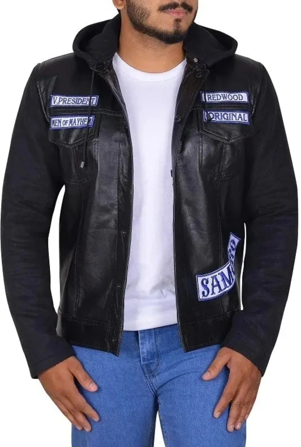 - Patches on Chest: President, Men of Mayhem, Redwood, Original, SAMCRO