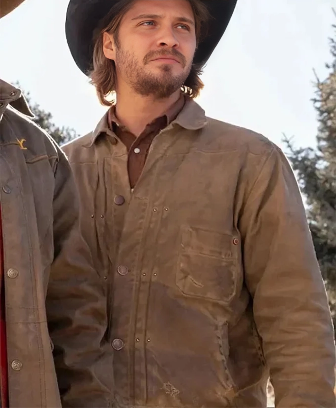 The Yellowstone S05 Kayce Jacket is one of those pieces that instantly gives off that rugged ranch vibe we all love. Let’s be real, Kayce Dutton, played by Luke Grimes, has that calm, powerful aura that makes every outfit look iconic. In Season 5 Episode 4, Kayce is seen wearing this brown waxed jacket during the emotional scene where he walks along the ranch reflecting on the difficult choices he’s had to make. The light brown tones and weathered look of the jacket perfectly match his thoughtful mood. So it reflects a strong, grounded, and authentic look.